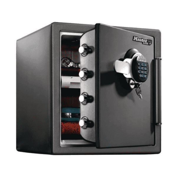 Ce coffre-fort Master Lock au format XL est parfait pour protéger une grande variété d’objets de valeur contre le feu, l’eau et les cambriolages. Sa certification UL/ETL garantit une résistance aux flammes pendant 2 heures à 927°C et une étanchéité pendant 24 heures à 20 cm d’immersion. Le double verrouillage ajoute une sécurité avancée : il faut déverrouiller avec une clé pour accéder au code électronique, un système idéal pour les petits commerces où l’accès au coffre doit être contrôlé par des niveaux de responsabilité. La combinaison électronique rétroéclairée permet un accès pratique et sécurisé, même dans des conditions de faible luminosité. Couleur : noir.
